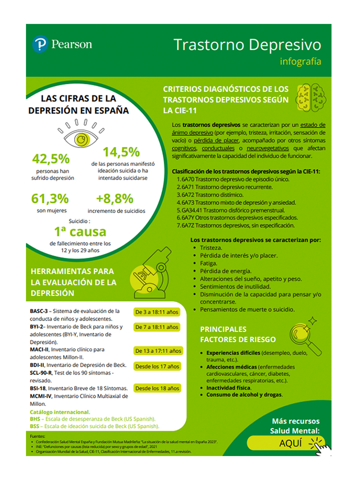 Descubra en esta infografía alguno de los principales síntomas y factores de riesgo del Trastorno Depresivo, así como las principales herramientas que recomendamos para su evaluación.